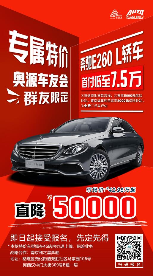 奥源车友会奔驰E260 L专场福利活动:裸车直降5万元,首付低至7.5万元起
