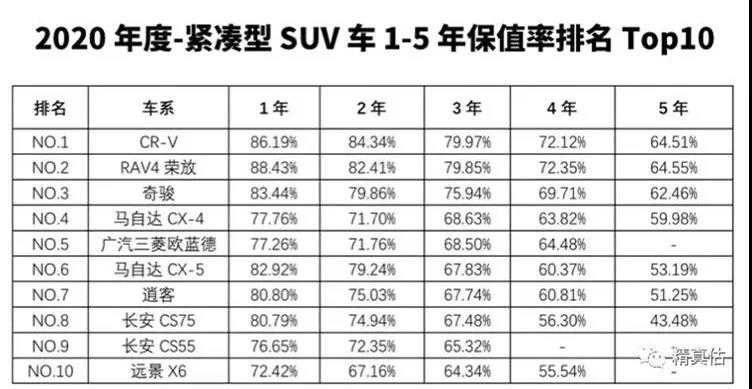 1、CR-V:排名第一的是我们的老朋友“保值神器”CRV——三年保值率79.97%。其低油耗、保养成本低及高普及率,都是它的筹码。